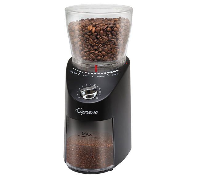 - The Infinity Plus Conical Burr Grinder will only grind when the red indicator on the bean container points to one of the fineness settings. Turn the selector knob and grinding starts instantly.