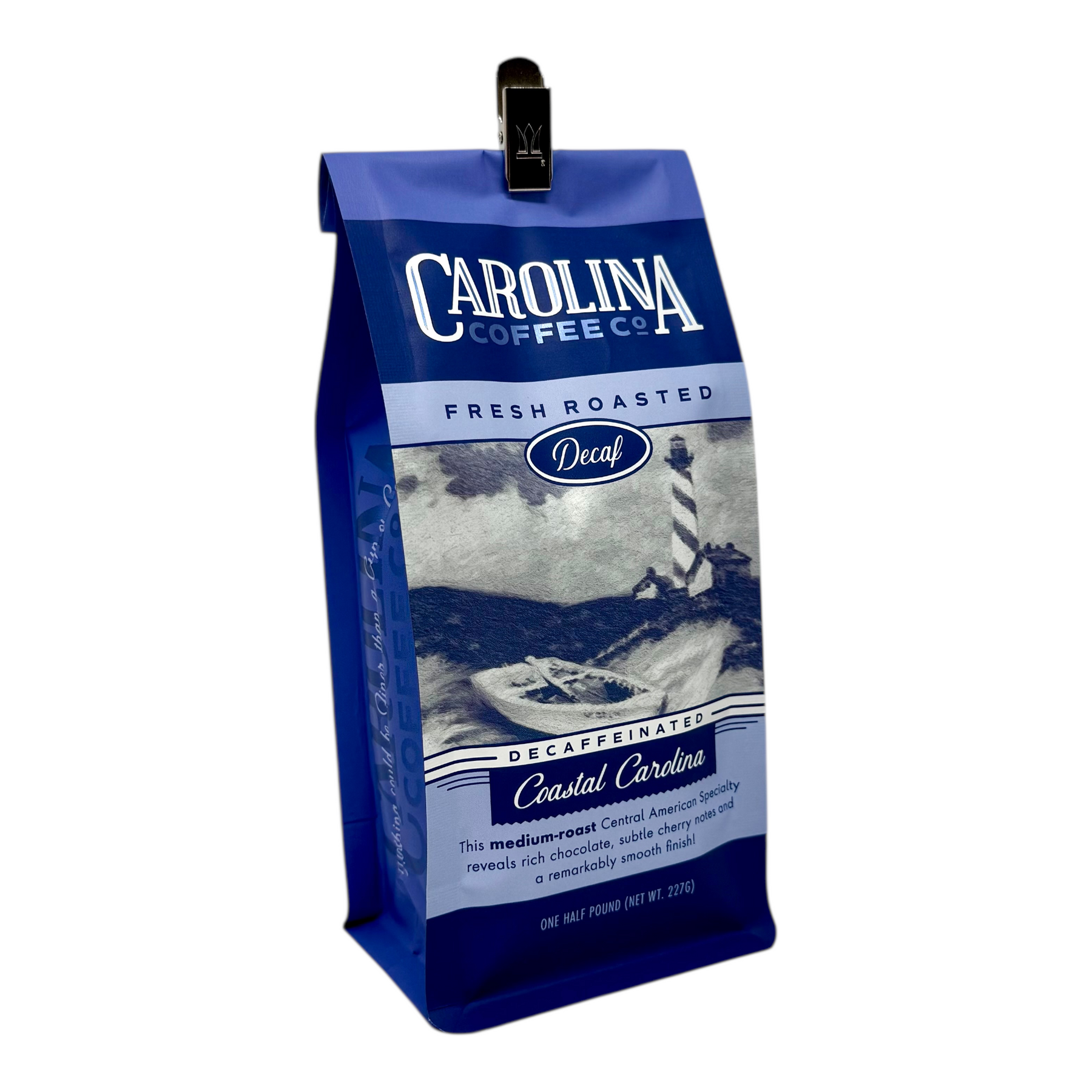 Enjoy the same great fresh-roasted taste of our Coastal Carolina Blend without the caffeine! We use only the patented Swiss Water Process, 100% chemical free.