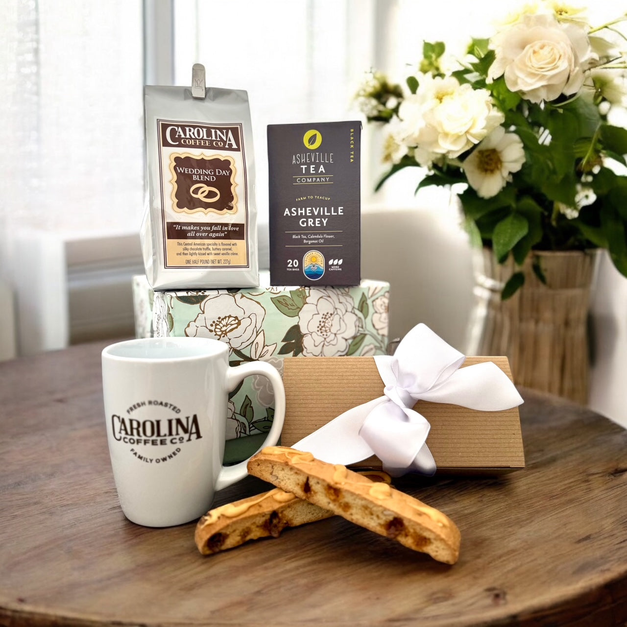 Included is a half pound bag of coffee (you get to choose her favorite), a box of 20 tea sachets, six "Sweet Java Brown' biscotti packed in a bakery box tied with ribbon and a porcelain logo mug for sipping.