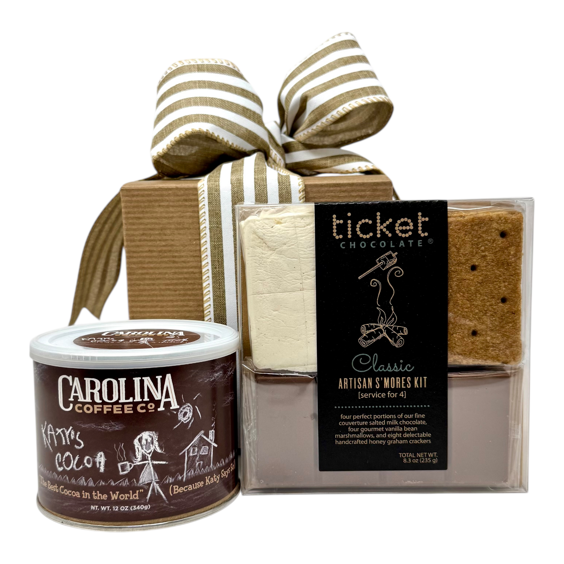 This gift includes a 12 oz. tin of Katy's cocoa and an artisan S'mores kit which serves four.  This indulgent kit brings together everything you need for the perfect gooey, melty, chocolate-marshmallow experience.